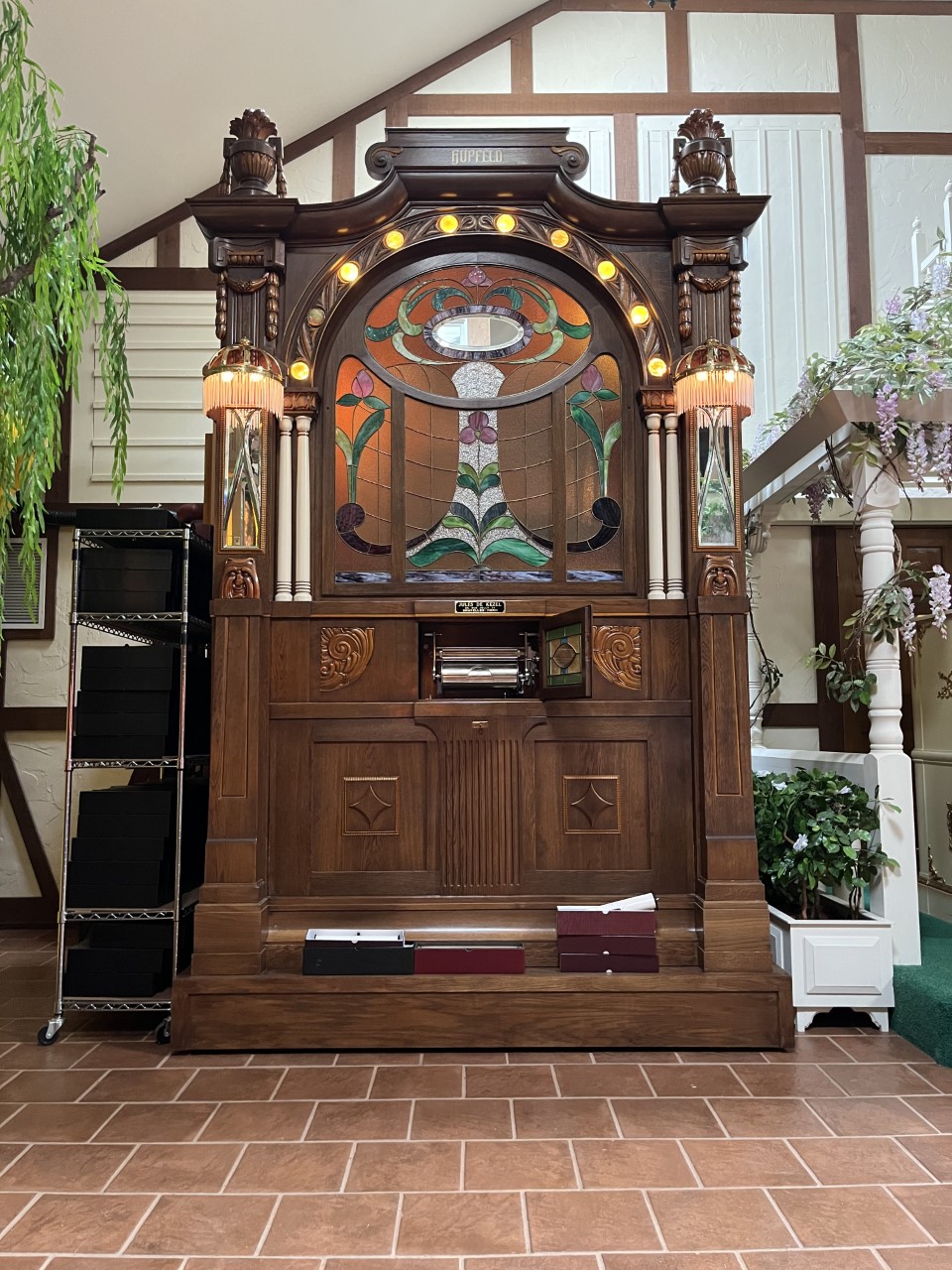 Un peu à l’écart, un beau Wurlitzer Tonophone. Ce piano à cylindre est une véritable exception dans le paysage américain où le rouleau de papier à musique est le standard. Rudolph Wurlitzer, immigré allemand, s’installe à Cincinnati en 1853 et y ouvre un commerce d’instruments de musique qu’il importe d’Allemagne. Les affaires sont florissantes. Il trouve un arrangement pour la fabrication de pianos et d’orgues mécaniques avec Eugène de Kleist, lui aussi d’origine allemande. Ce dernier est devenu facteur d’orgue par des formations auprès de facteurs européens réputés dont, entre autres, Limonaire à Waldkirch. Il s’installe à Londres où il fabrique des orgues à cylindres pour les forains et exporte vers les USA. Lorsqu’en 1892, les américains mettent des taxes importantes sur l’importation d’instruments de musique y compris les instruments mécaniques (donc aussi les boîtes à musique suisses), de Kleist s’exile à New York et y fonde la North Tonawanda Barrel Organ Factory en 1893. Wurlitzer lui assure une relative tranquillité commerciale en lui garantissant la vente de toute sa production avant de se porter acquéreur de l’entreprise en 1908.